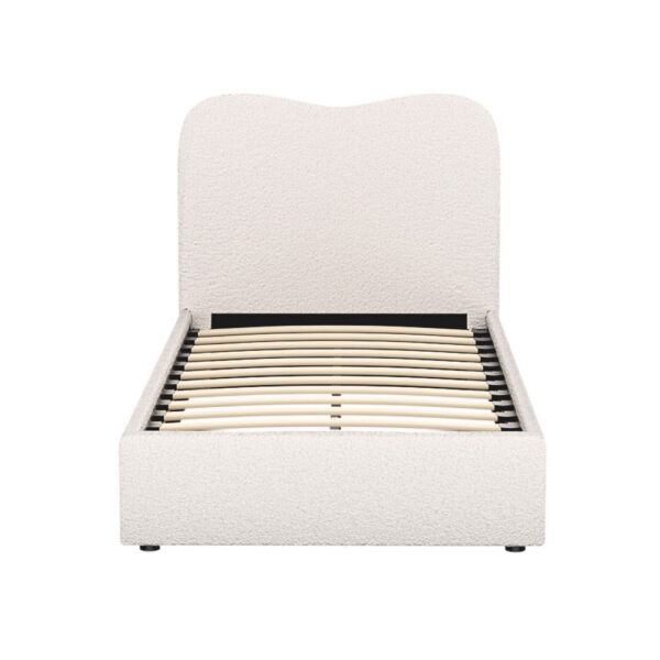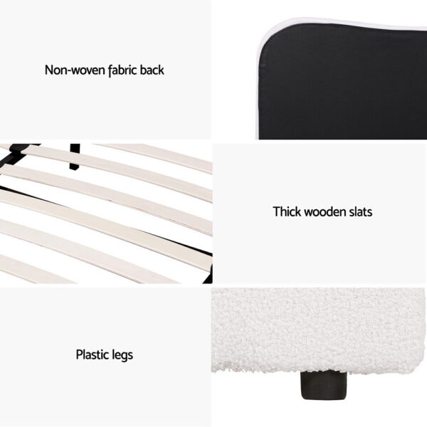 Introducing our elegant Artiss bed frame: upholstered in boucle fabric, featuring wooden frame with slat support, padded headboard, smooth edge finish, and sturdy metal connectors for a blend of style and functionality in your bedroom.