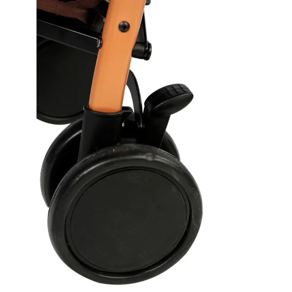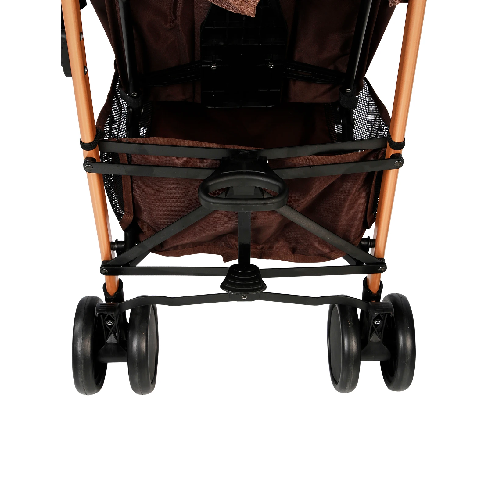 This stroller features a sleek dark brown design that complements any setting. It includes an adjustable canopy for sun protection and a spacious seat for child comfort. The stroller is equipped with smooth-rolling wheels for effortless navigation on various terrains. Additionally, it offers ample storage space under the seat for carrying essentials.