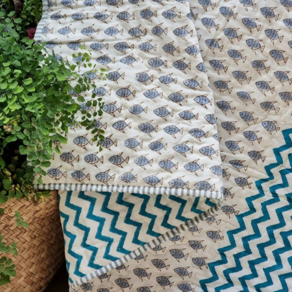 Little FishGOTS certified organic cotton reversible quilt for infants.