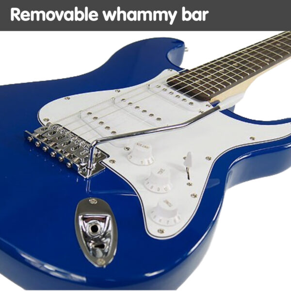 This A-grade, full-sized Karrera electric guitar has a fully adjustable bridge, tone and volume controls, a 3-layer pickguard, and a removable whammy bar. It’s ideal for teens, students, or anyone who wants to hone their musical talents further. Play alone, start a band, or make your own music – with this electric guitar, the possibilities are endless!