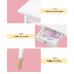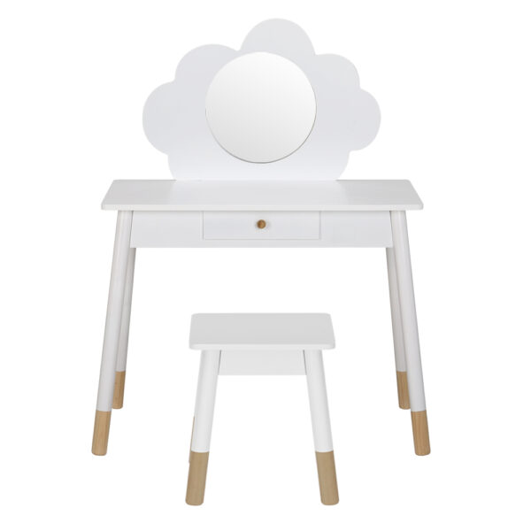 The Keezi Kids Dressing Table is perfect for kids on the go. Featuring a detachable top mirror and an easy-to-use storage drawer, the vanity has everything you could want for your child to play pretend or get ready for the day. Made from quality painted MDF board atop solid rubberwood legs, the vanity is easy to maintain and will stick with your children for years to come. The top cloud motif will spark your little one’s imagination. The drawer has an easy-grasp handle and good storage capacity to fit everything from makeup to fashion accessories. Constructed with safe rounded corners and edges, the table and chair set is absolutely safe for use by your child and designed to handle robust use with its strong weight capacity. Your child will love getting ready at their new Keezi Kids Dressing Table.