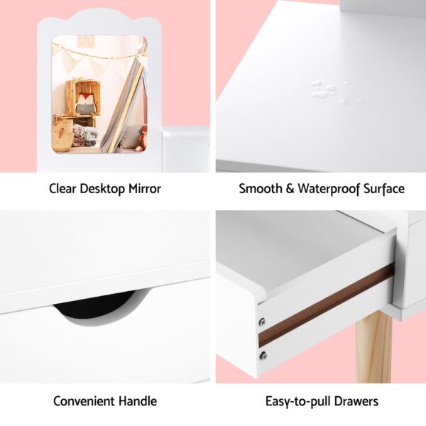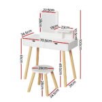 The Keezi Kids Dressing Table Vanity Makeup Chair Set is the perfect addition to any child’s room, combining style, functionality, and safety. Crafted with strong pine wood legs for exceptional stability, it features a spacious tabletop and large drawers for ample storage. Designed with smooth, rounded corners and reinforced connections, it ensures safe use for children aged 3 to 7. The set includes a matching vanity makeup chair and a mirror for added charm.